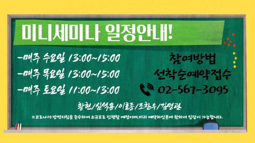 미니세미나 일정안내 페이지 정보 작성자 … 댓글 0건 조회Hit 3,359회 작성일Date 21-03-30 14:55 본문 예약은 필수입니다. 02 - 567 - 3095 목록 답변 이전글세미나 안내 24.11.25 댓글목록 댓글목록 등록된 댓글이 없습니다.